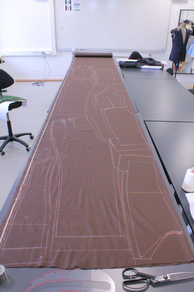 The second day was spent cutting the fabric and marking stitches. As the client is quite tall, I had to figure out how to cut down the fabric use. I have been informed that the standard fabric amount of Danish persons is around 3,5 meters. Given he is also getting a vest, and that the trousers are at the waist, the use of 4,1 meters of fabric is acceptable.
