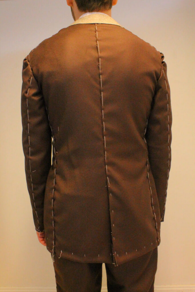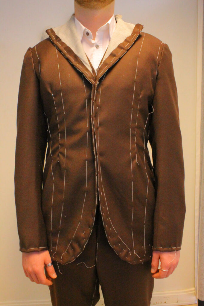 The third day was spent hand sewing the garments together. Using a weaker cotton thread, temporary stitches are made to get an idea of the general fitting. I have made sure that there is plenty of extra fabric, in case larger changes are needed for the garment. It is now ready for the first fitting.