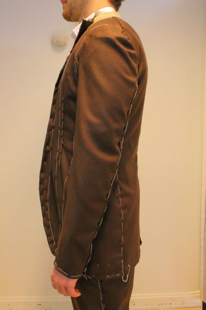 For the second fitting, the front was corrected, a bit more was needed at the bottom and a little was to be taken off the front. Due to his larger shoulderblades, it was decided to give a bit extra lenght to the back overall, with the dart being moved to where the shape was needed. Some fabric would be removed from the armhole through the dart, so it wouldn’t stand out.