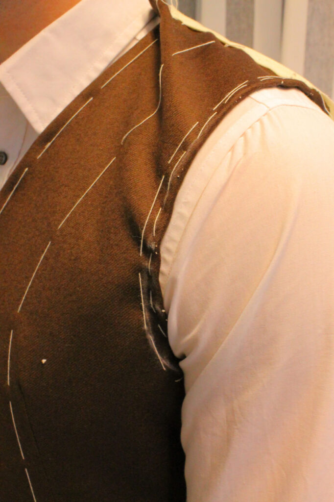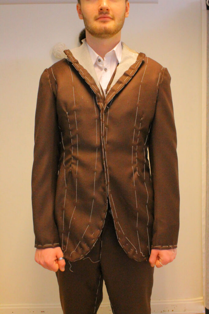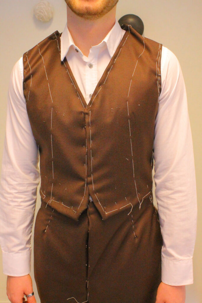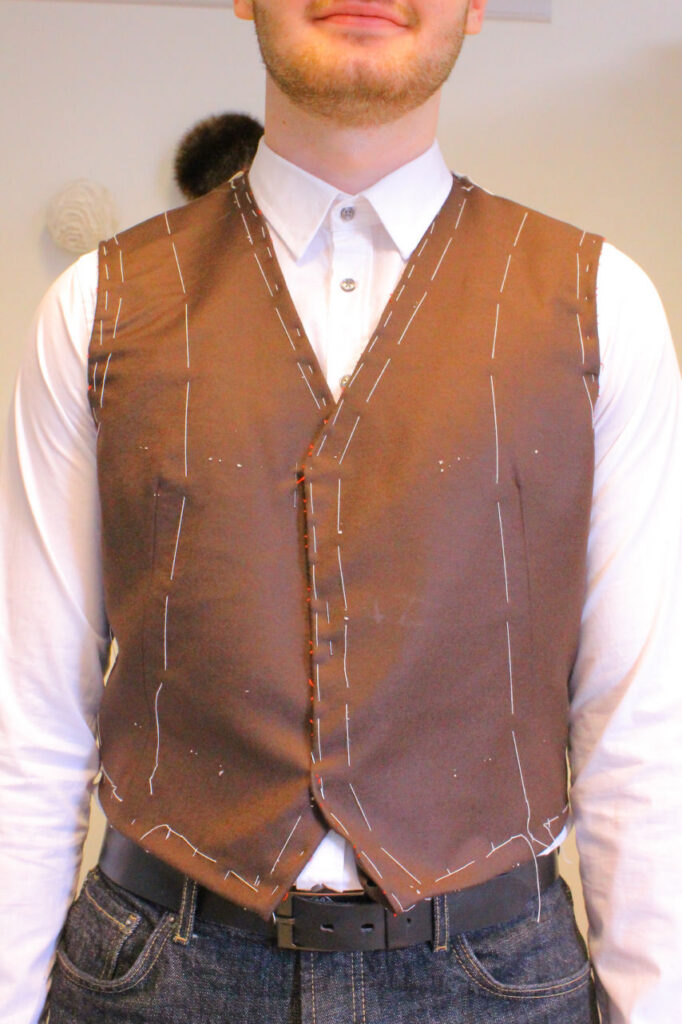 It should be noted that a mistake was made during the drafting of the vest, where the vest was not made wide enough. Before the fitting, we decided to give it plenty of extra space in the sides, so we could properly see the fit.