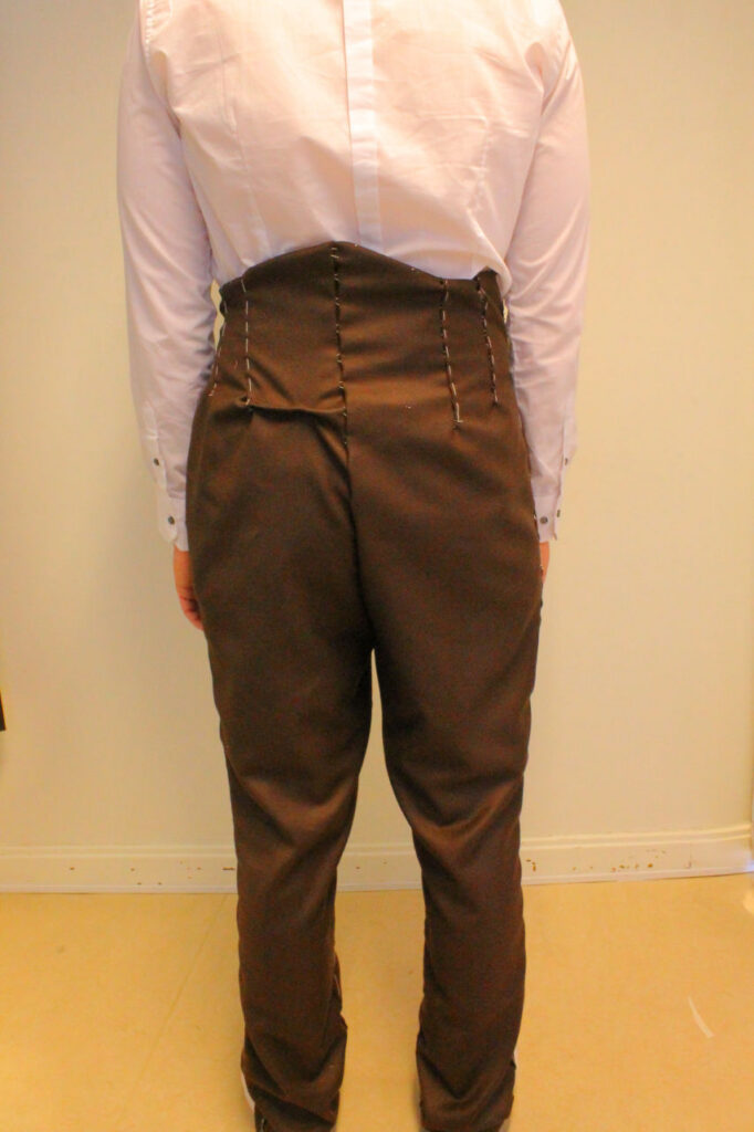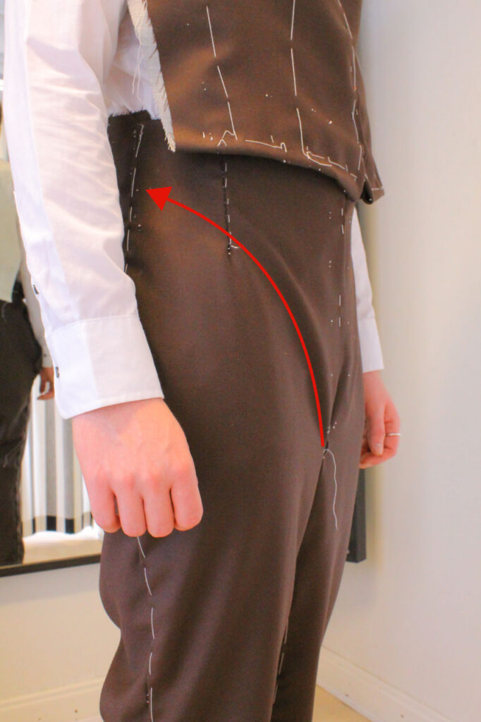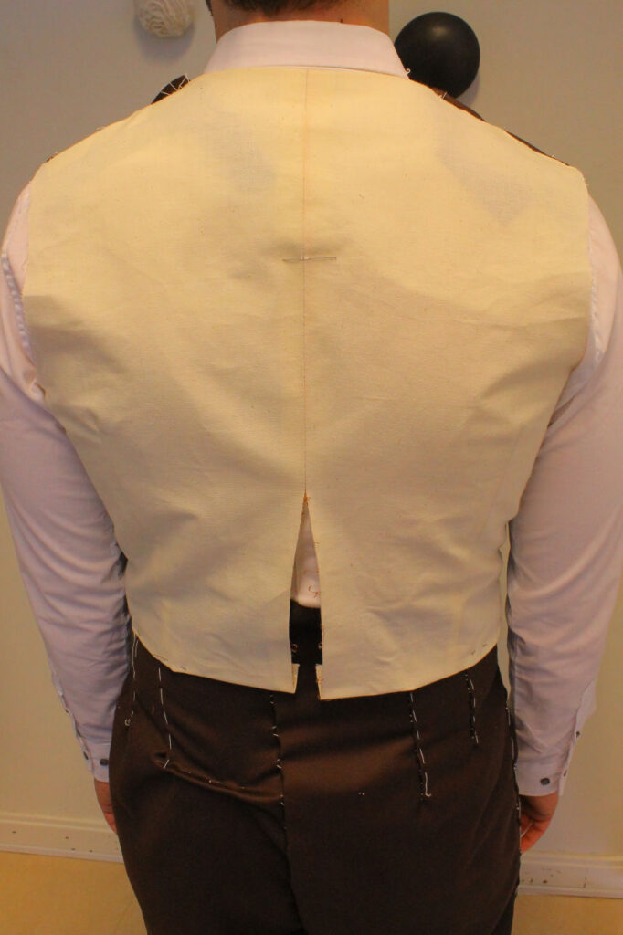 The trousers sit at the waist of the client, with a sway up on the backside, so when he sits down, his vest will be sure to not show his shirt. I noted that the middle seam seemed quite long, however that is compared to me, a person with a short torso, so proportionally his pattern is quite normal in that regard.