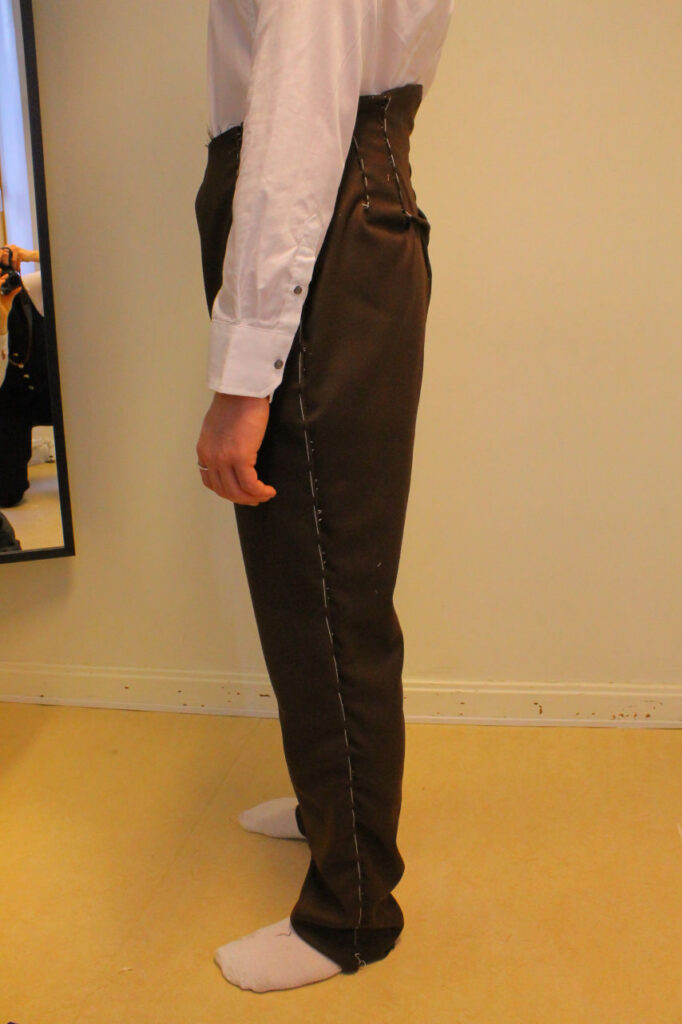 Some persons might note that the back thigh has too much space, however this is only in comparison to modern trousers. Most modern trousers are quite slim on the backside, the issues caused by this would be elastics and less requirement for movement. However given that this suit is more for regular use, and that the fabric does not have the elastic ability, making the trousers like traditional trousers was deemed neccesary, and is a standard for me, as I put function as a priority, if the costumer does not have a specific requirement of tightness.